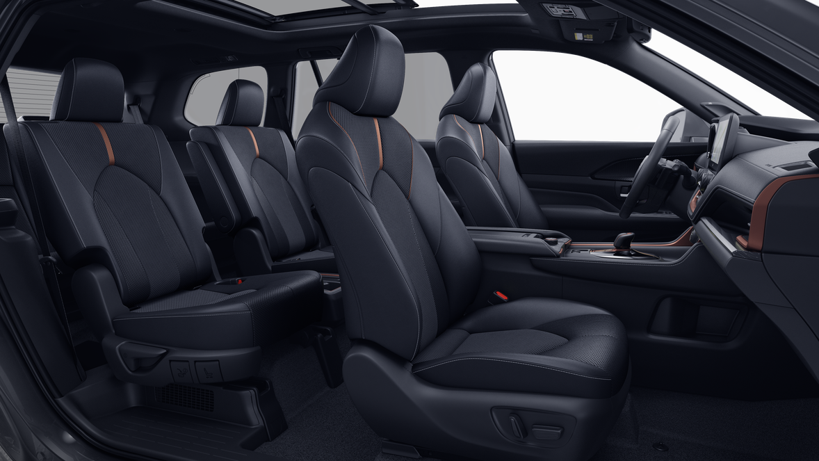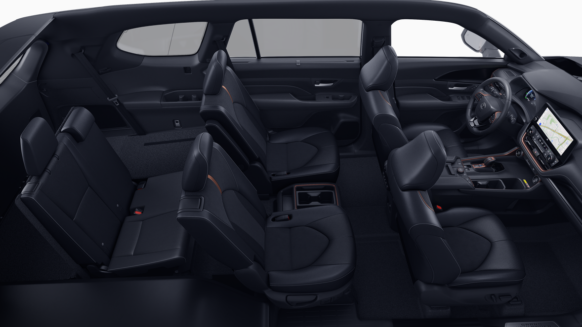 - 7-passenger seating with second-row fold-down captain's chairs and fold-down inboard armrests, adjustable headrests and two cup holders mounted on the floor; and 60/40 split, fold-down third-row seats with sliding headrests and recline function
