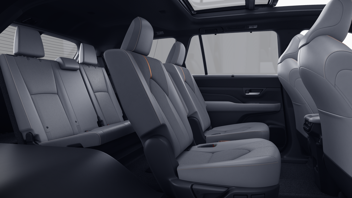 - 7-passenger seating with second-row fold-down captain's chairs and fold-down inboard armrests, adjustable headrests and two cup holders mounted on the floor; and 60/40 split, fold-down third-row seats with sliding headrests and recline function