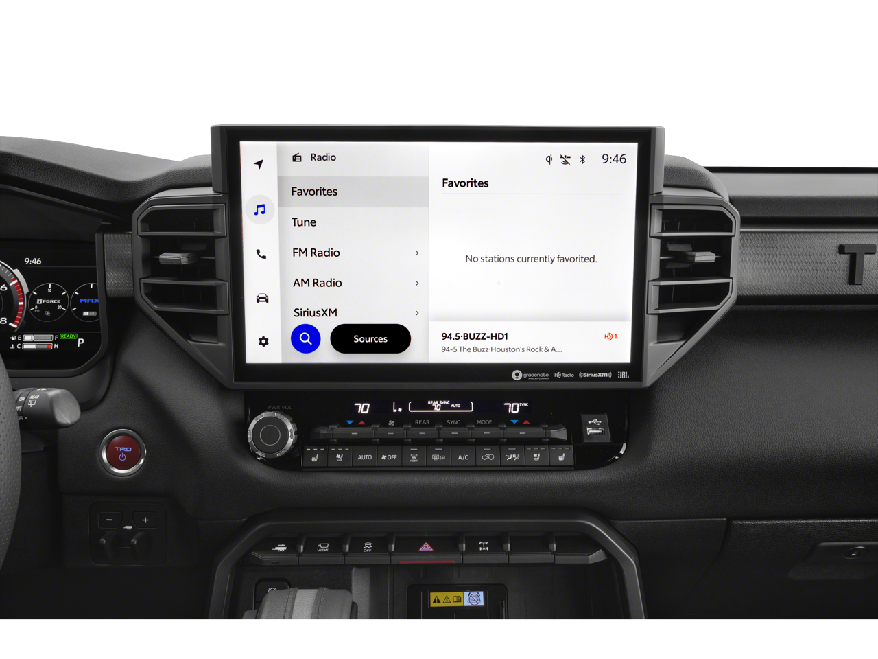 - TRD Pro leather-wrapped manual tilt/telescopic steering wheel with TRD badge, red center stripe, and phone, audio, display/infotainment and Driver Assist controls