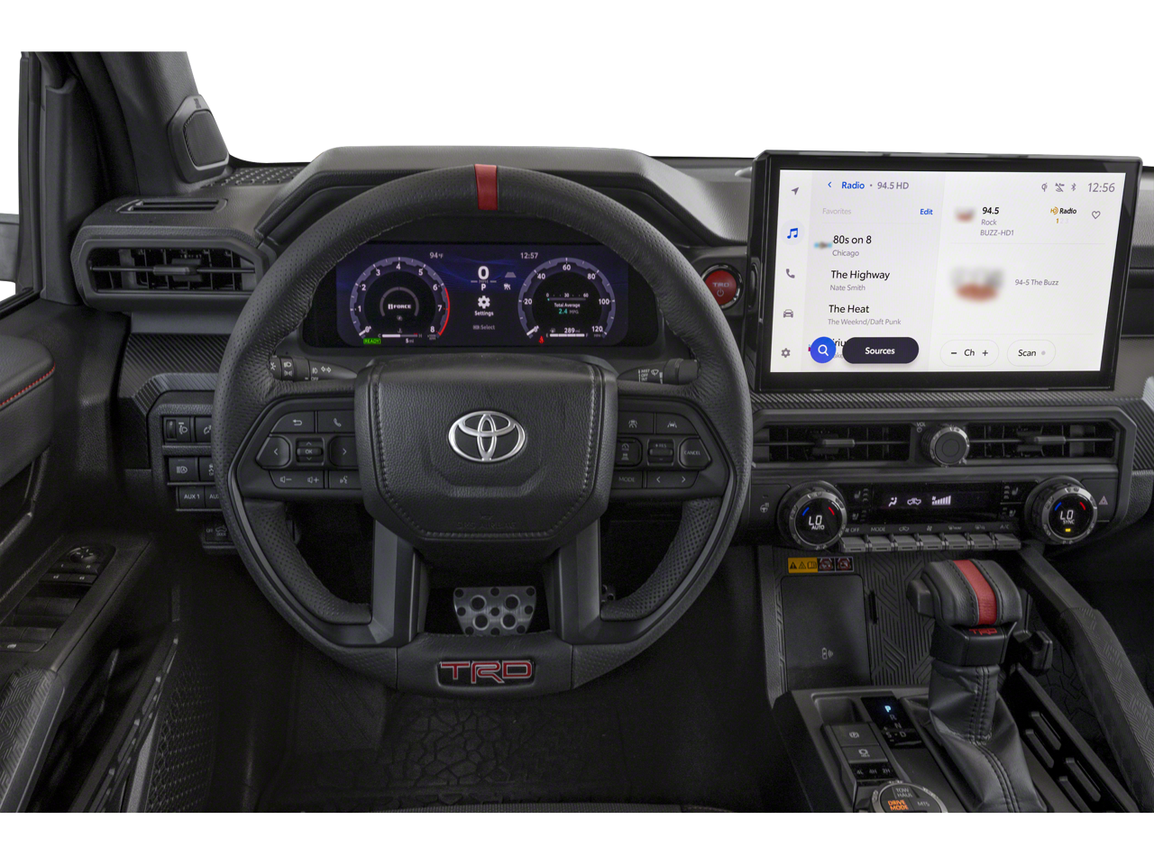 - TRD Pro leather-trimmed manual tilt/telescopic steering wheel with TRD badge, red center stripe, and phone, audio, display/infotainment, and Driver Assist controls