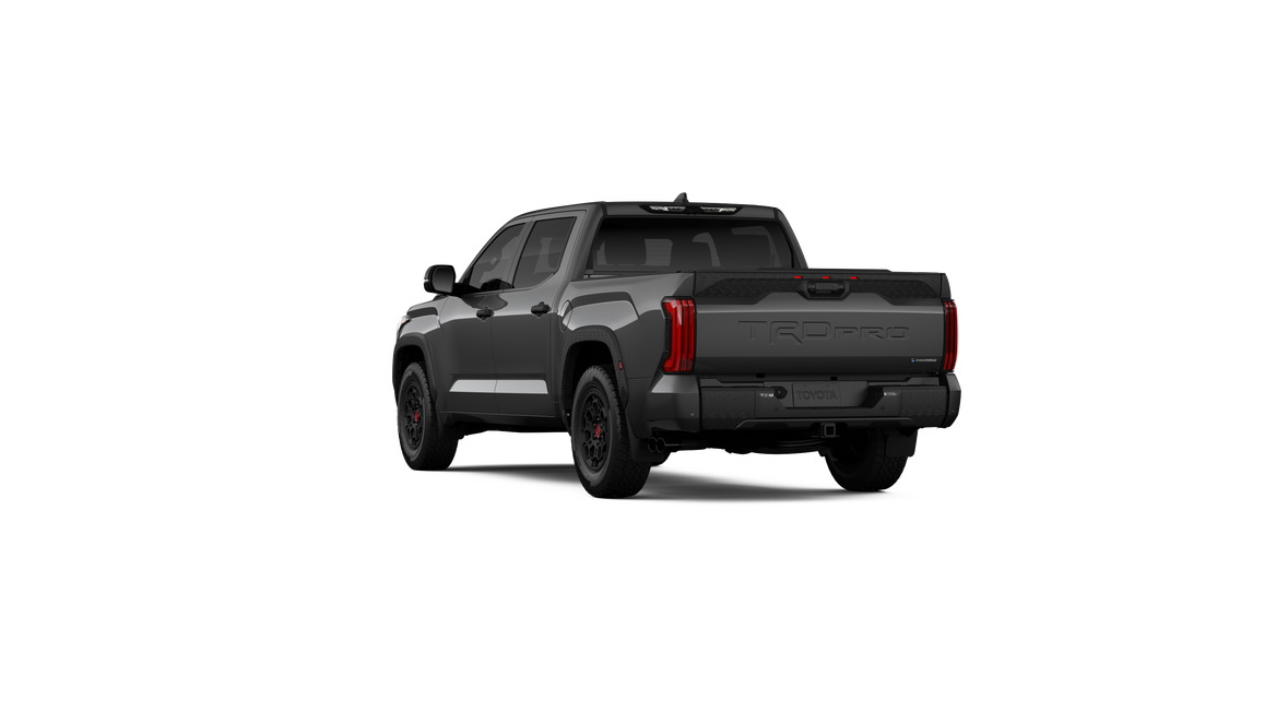 - "TRD PRO" hood badge; black door handles; black window molding and mirror caps; black technical-camo-grained tailgate spoiler and overfenders with marker lights